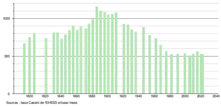L'évolution du nombre d'habitants est connue à travers les recensements de la population effectués dans la commune depuis 1793. Pour les communes de moins de 10 000 habitants, une enquête de recensement portant sur toute la population est réalisée tous les cinq ans, les populations de référence des années intermédiaires étant quant à elles estimées par interpolation ou extrapolation[35]. Pour la commune, le premier recensement exhaustif entrant dans le cadre du nouveau dispositif a été réalisé en 2005[36].