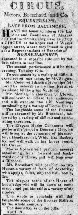 La compagnie de théâtre équestre Circus of Pépin and Breschard, fondée par l'Américain Victor Pépin[1] et le Français Jean Baptiste Casmiere Breschard, arrive en novembre 1807 aux États-Unis en provenance de Madrid, Espagne, où ils s'étaient produits pendant les saisons 1805 et 1806. Ils parcourent ce nouveau pays jusqu'en 1815, et deviennent les pionniers du cirque traditionnel en Amérique du Nord.