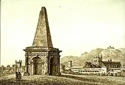 Cette « pyramide » est en réalité un ouvrage maçonné en pierre restauré et rappelant la forme d'un obélisque, édifié au-dessus d'un tétrapyle tenant lieu de piédestal. Il se peut qu'il remplace un véritable obélisque, aujourd'hui perdu[5].