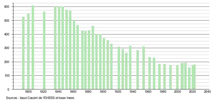 L'évolution du nombre d'habitants est connue à travers les recensements de la population effectués dans la commune depuis 1793. Pour les communes de moins de 10 000 habitants, une enquête de recensement portant sur toute la population est réalisée tous les cinq ans, les populations de référence des années intermédiaires étant quant à elles estimées par interpolation ou extrapolation[27]. Pour la commune, le premier recensement exhaustif entrant dans le cadre du nouveau dispositif a été réalisé en 2005[28].