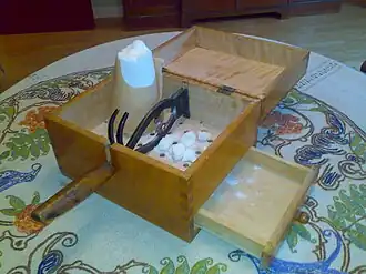 Il existait également une version tout-en-un : une boîte qui pouvait servir de récipient pour le pain de sucre avec des pinces intégrées et un tiroir collecteur pour les résidus à grain fin de la découpe du sucre.