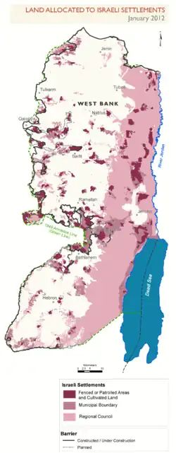 Entre 1990 et 2001, le statut du territoire de Cisjordanie fait l'objet de négociations infructueuses entre l'Autorité palestinienne et Israël. Depuis 2002, à la suite de la Seconde intifada, Israël édifie en Cisjordanie une barrière de séparation, sous la forme d'un mur en béton d'une hauteur de plus de huit mètres dans le secteur de Jérusalem, ou sous la forme de barrières hautes, avec zone protégée visant à « lutter contre les intrusions de terroristes palestiniens » sur le territoire israélien[4].