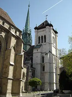C'est durant le Bas-Empire qu'est construite une cathédrale double (de) avec un baptistère (groupe cathédral). Jusqu'au XIe siècle, la structure évolue jusqu'à la création d'un bâtiment unique mais c'est au XIIe siècle que le premier prince-évêque de Genève, Arducius de Faucigny, entame la construction de l'actuelle cathédrale romano-gothique — combinant le style roman (remarquables chapiteaux historiés) dans les parties anciennes et le style gothique dans les parties les plus récentes — étape qui s'étend de 1150 à 1250. Construite pour le rite catholique, l'avènement de la Réforme protestante, au milieu du XVIe siècle, avec sa philosophie d'austérité bouleverse l'intérieur de l'édifice, le vidant de tout ornement et recouvrant les décors polychromes du Moyen Âge. Seuls les vitraux sont épargnés. Les grands travaux reprennent au XVIIIe siècle avec la réalisation — sur les plans de l'architecte Benedetto Alfieri — du portique gréco-romain entre 1752 et 1756, notamment en raison de la menace d'écroulement de la partie occidentale du bâtiment.