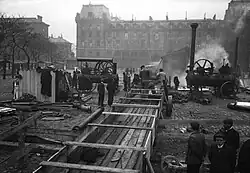 En 1905, les travaux de construction de la ligne 4 conduisent au démantèlement en surface d'une grande partie du marché aux fleurs. Le conservateur du musée Carnavalet Georges Cain écrit : « Les affouillements profonds nécessités par la construction des deux gares desservant le Métro — qui passera ici à 25 mètres sous terre — ont transformé la moitié de la place en un gigantesque chantier où sifflent les machines, manœuvrent les grues, circulent les wagonnets ». Il s'agit de la première ligne de métro à passer sous la Seine, d'où des travaux particulièrement difficiles pouvant occasionner des accidents mortels. Le Petit Parisien relate ainsi « la catastrophe du marché aux fleurs » du 23 décembre 1907, quand cinq ouvriers meurent dans un caisson mal pressurisé. Plusieurs semaines plus tard, un terrassier succombe après avoir été blessé à la tête[1].