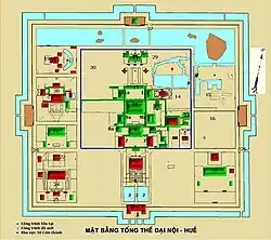 Cette partie de la Cité impériale recouvre une surface de 10 hectares. Son périmètre est de 1 229,36 m. La Cité est entourée de murs de 3,72 m de hauteur et de 0,72 m d'épaisseur et sont percés de sept ouvertures. Ses bâtiments et ses nombreuses cours ont été construits à partir de 1802 sous le règne de l'empereur Gia Long, jusqu'en 1833 sous le règne de son fils, l'empereur Minh Mang. La principale porte d'entrée, Dai Cung, a été construite en 1833.