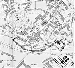 À la fin du IIIe siècle, à la suite de l'invasion attribuée aux Alamans, la cité romaine se rétrécit sur cinq hectares et demi[2], en se retirant sur un petit plateau derrière des remparts[3],[4]. Intégrant la moitié nord-ouest de l'amphithéâtre de Vesunna[2], ces murailles sont construites vers 284 apr. J.-C. par remploi d'éléments des monuments de la ville (des vestiges subsistent de ces remparts) et cette troisième cité prend le nom de Civitas Petrucoriorum (« cité des Pétrocores »)[5], lieu qui va devenir « la Cité » à la fin de l'Antiquité[4],[6]. Cette restructuration de la cité antique s'explique principalement par le manque d'entretien du patrimoine, l'effervescence de l'évergétisme et l'intendance plus indulgente de la fiscalité locale[7]. Cette enceinte compte à l'époque vingt-quatre tours de 8 m de diamètre, vingt-trois courtines et trois portes[Note 1],[4],[8], le long d'un rempart mesurant 950 m, sur 5 à 6 m de largeur et 9 m de hauteur[7]. Toutefois, malgré ce réflexe de peur appuyé par l'instabilité politique de l'Empire et la crise économique, la capitale des Pétrocores gère toujours son territoire[7].