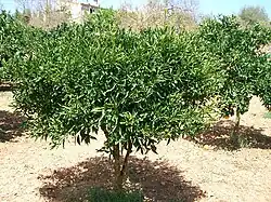 L'arbre généralement petit peut atteindre 8 m de hauteur[40], vigoureux et dense, souvent épineux. Les feuilles de tailles variables sont allongées, pointues, d'un vert brillant, avec un pétiole légèrement ailé.