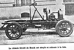 L’entreprise basée à Paris a commencé à produire des automobiles en 1906. Le nom de la marque était Civelli de Bosch[1]. Le premier modèle était la 8/10 CV, qui a été présentée au Salon de l’Automobile de Paris en 1906. Le véhicule était équipé d’un moteur à deux cylindres. Le moteur avait 1 595 cm3 avec un alésage de 92 mm et une course de 120 mm. Comme il était de coutume à l’époque, le volant était sur le côté droit. Il a été suivi en 1907 par le 16/25 CV avec un moteur quatre cylindres et le 40/50 CV avec un moteur six cylindres. Tous les véhicules avaient une transmission par arbre. La production s’est terminée en 1909.