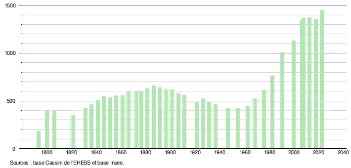 L'évolution du nombre d'habitants est connue à travers les recensements de la population effectués dans la commune depuis 1793. Pour les communes de moins de 10 000 habitants, une enquête de recensement portant sur toute la population est réalisée tous les cinq ans, les populations de référence des années intermédiaires étant quant à elles estimées par interpolation ou extrapolation[20]. Pour la commune, le premier recensement exhaustif entrant dans le cadre du nouveau dispositif a été réalisé en 2007[21].