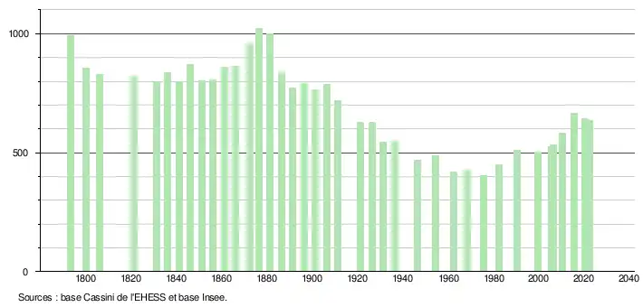 | L'évolution du nombre d'habitants est connue à travers les recensements de la population effectués dans la commune depuis 1793. Pour les communes de moins de 10 000 habitants, une enquête de recensement portant sur toute la population est réalisée tous les cinq ans, les populations de référence des années intermédiaires étant quant à elles estimées par interpolation ou extrapolation[18]. Pour la commune, le premier recensement exhaustif entrant dans le cadre du nouveau dispositif a été réalisé en 2005[19]. En 2022, la commune comptait 636 habitants[Note 2], en évolution de −6,19 % par rapport à 2016 (Gironde : +6,91 %, France hors Mayotte : +2,11 %). |