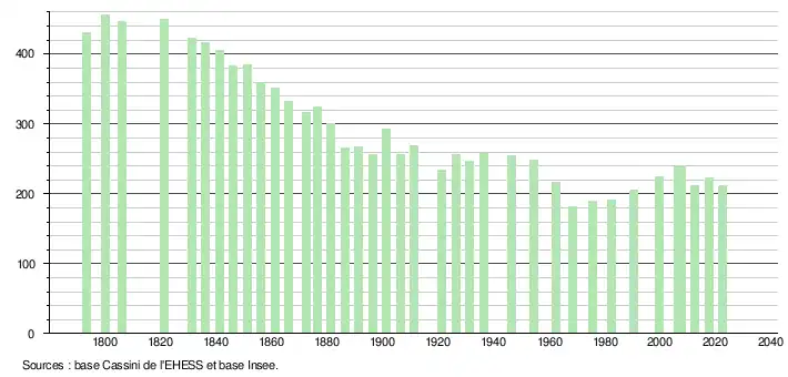 L'évolution du nombre d'habitants est connue à travers les recensements de la population effectués dans la commune depuis 1793. Pour les communes de moins de 10 000 habitants, une enquête de recensement portant sur toute la population est réalisée tous les cinq ans, les populations de référence des années intermédiaires étant quant à elles estimées par interpolation ou extrapolation[28]. Pour la commune, le premier recensement exhaustif entrant dans le cadre du nouveau dispositif a été réalisé en 2007[29].
