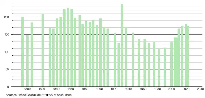 L'évolution du nombre d'habitants est connue à travers les recensements de la population effectués dans la commune depuis 1793. Pour les communes de moins de 10 000 habitants, une enquête de recensement portant sur toute la population est réalisée tous les cinq ans, les populations de référence des années intermédiaires étant quant à elles estimées par interpolation ou extrapolation[14]. Pour la commune, le premier recensement exhaustif entrant dans le cadre du nouveau dispositif a été réalisé en 2004[15].