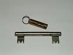 Sa particularité est de posséder deux pannetons (parties destinées à actionner le pêne de la serrure). Après avoir déverrouillé la serrure, il faut récupérer la clé de l'autre côté de la porte et refermer celle-ci. Également appelée « Schließzwangschlüssel », en français « clé pour contraindre à la fermeture », cette clé avait en effet été inventée pour obliger les habitants d'un logement à refermer la porte après l'avoir ouverte. Le mécanisme est tel qu'il est impossible de retirer la clé une fois le pêne déverrouillé. On est donc obligé de refermer la porte pour la récupérer, comme à l'hôtel Fassanenhaus[1].