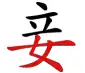 qiè « concubine » → « femme » + 立 « debout » ; la concubine n'est pas une épouse en titre et a rang d'attendante, de servante.