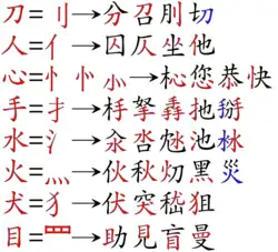 Par exemple, dans le caractère 媽  mère »), le radical de gauche (女), qui se prononce en chinois mandarin, est à la fois une indication sémantique (l'idée de femme) et la clé de dictionnaire sous laquelle le caractère est rangé. Inversement, le radical à droite du caractère, 馬 , fournit ici une indication purement phonétique : ce caractère signifie « cheval », sans rapport aucun avec le sens de « mère ».