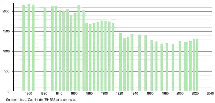 L'évolution du nombre d'habitants est connue à travers les recensements de la population effectués dans la commune depuis 1793. Pour les communes de moins de 10 000 habitants, une enquête de recensement portant sur toute la population est réalisée tous les cinq ans, les populations de référence des années intermédiaires étant quant à elles estimées par interpolation ou extrapolation[40]. Pour la commune, le premier recensement exhaustif entrant dans le cadre du nouveau dispositif a été réalisé en 2008[41].