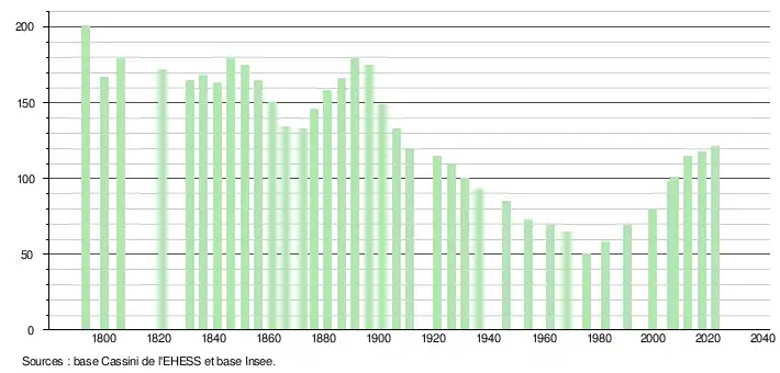 L'évolution du nombre d'habitants est connue à travers les recensements de la population effectués dans la commune depuis 1793. Pour les communes de moins de 10 000 habitants, une enquête de recensement portant sur toute la population est réalisée tous les cinq ans, les populations de référence des années intermédiaires étant quant à elles estimées par interpolation ou extrapolation[15]. Pour la commune, le premier recensement exhaustif entrant dans le cadre du nouveau dispositif a été réalisé en 2007[16].