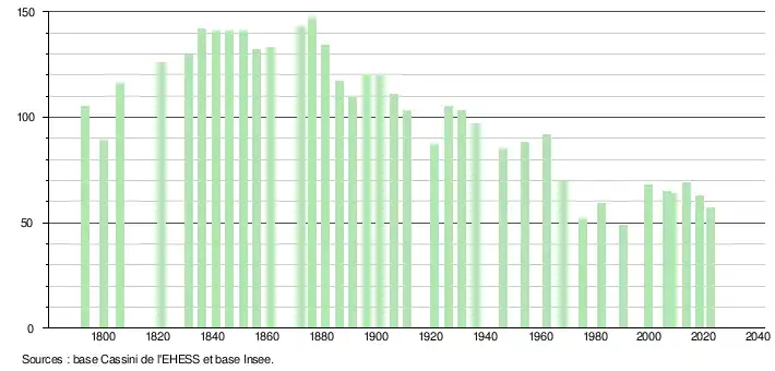 L'évolution du nombre d'habitants est connue à travers les recensements de la population effectués dans la commune depuis 1793. Pour les communes de moins de 10 000 habitants, une enquête de recensement portant sur toute la population est réalisée tous les cinq ans, les populations de référence des années intermédiaires étant quant à elles estimées par interpolation ou extrapolation[18]. Pour la commune, le premier recensement exhaustif entrant dans le cadre du nouveau dispositif a été réalisé en 2008[19].