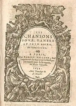 - Les Chansons pour danser et pour boire du sieur Guyot [1-2 v.]. Paris, Robert III Ballard, 1654. 1 vol. 8°. Guillo 2003 n° 1654-I, RISM G 5173 et 5174.