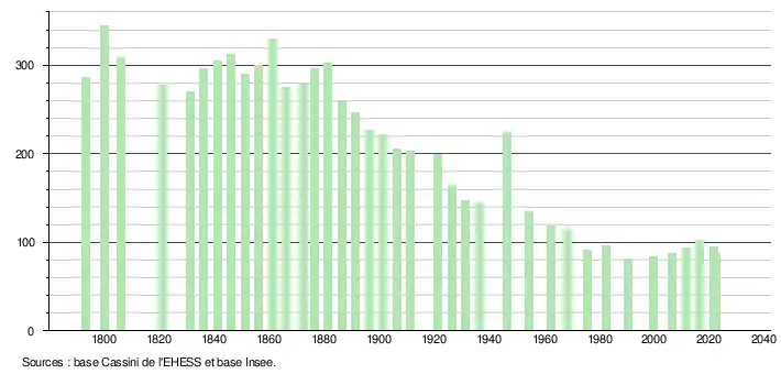 L'évolution du nombre d'habitants est connue à travers les recensements de la population effectués dans la commune depuis 1793. Pour les communes de moins de 10 000 habitants, une enquête de recensement portant sur toute la population est réalisée tous les cinq ans, les populations de référence des années intermédiaires étant quant à elles estimées par interpolation ou extrapolation[46]. Pour la commune, le premier recensement exhaustif entrant dans le cadre du nouveau dispositif a été réalisé en 2006[47].