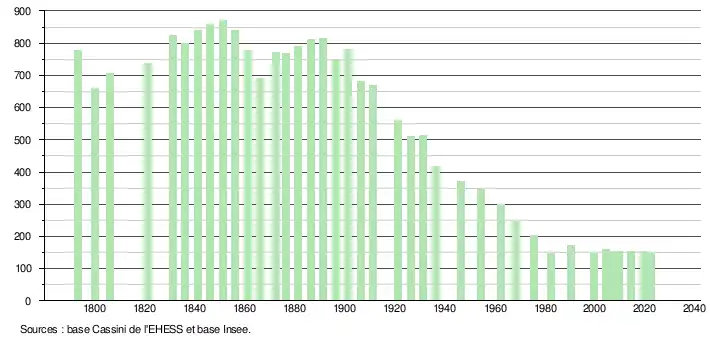L'évolution du nombre d'habitants est connue à travers les recensements de la population effectués dans la commune depuis 1793. Pour les communes de moins de 10 000 habitants, une enquête de recensement portant sur toute la population est réalisée tous les cinq ans, les populations de référence des années intermédiaires étant quant à elles estimées par interpolation ou extrapolation[22]. Pour la commune, le premier recensement exhaustif entrant dans le cadre du nouveau dispositif a été réalisé en 2004[23].