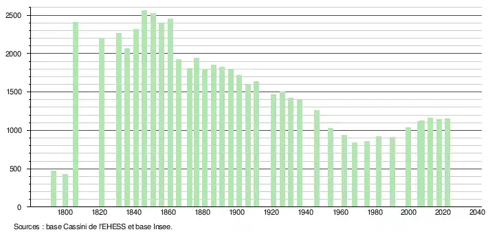 L'évolution du nombre d'habitants est connue à travers les recensements de la population effectués dans la commune depuis 1793. Pour les communes de moins de 10 000 habitants, une enquête de recensement portant sur toute la population est réalisée tous les cinq ans, les populations de référence des années intermédiaires étant quant à elles estimées par interpolation ou extrapolation[15]. Pour la commune, le premier recensement exhaustif entrant dans le cadre du nouveau dispositif a été réalisé en 2007[16].