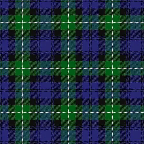 À noter la fausse symétrie du tartan : les bandes bleues sont chargées alternativement d'un double filet noir central, et de deux doubles filets noirs latéraux, similaire en ceci au tartan du Black Watch.