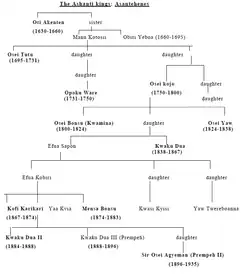 Osei Toutou, premier roi de le royaume ashanti nommé asantehene[note 1], succède à Obiri Yeboha dans une période où le contrôle de Kumasi est instable. Cependant, au travers de conquêtes, il soumet les petits états afin de former le royaume Ashanti. Il est le premier roi Ashanti appartenant au clan Oyoko[28]. Le titre de Kumasihene (chef de Kumasi) et d'Asantehene (roi ashanti) sont fusionnés et au terme d'un conflit avec son frère Opokou Waré, de nouvelles règles dynastiques sont instaurées avec un principe d'alternance et un renforcement des fonctions de l'Asantehemaa (reine mère ashanti). Ces changements provoquent l'émergence de plusieurs branches dynastiques et des conflits de succession[29]. Les Asantehemaa prennent en charge la désignation des héritiers légitimes en assurant la bonne interprétation de la généalogie Oyoko et des différentes lignées[30].