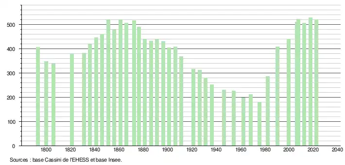 L'évolution du nombre d'habitants est connue à travers les recensements de la population effectués dans la commune depuis 1793. Pour les communes de moins de 10 000 habitants, une enquête de recensement portant sur toute la population est réalisée tous les cinq ans, les populations de référence des années intermédiaires étant quant à elles estimées par interpolation ou extrapolation[24]. Pour la commune, le premier recensement exhaustif entrant dans le cadre du nouveau dispositif a été réalisé en 2007[25].