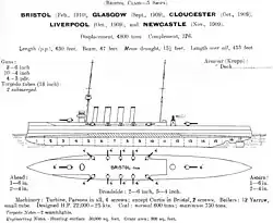 La classe Bristol a été commandée dans le cadre du Programme 1908–09 et réceptionnée au plus tard en 1910. Ils faisaient 138,1 m de long, avec une largeur de 14,3 m et un tirant d'eau de 4,7 m. Le déplacement normal était de 4 900 tonnes et de 5 400 tonnes en charge. Douze chaudières Yarrow et trois turbines à vapeur de 22000 cv (16,000 kW), leur donnait une vitesse de 25 nœuds (46 km/h). Les chaudières étaient mixtes et pouvaient utiliser le charbon ou le fioul, avec 1 353 tonnes de charbon et 260 tonnes de fioul en soutes, leur donnant une autonomie d'environ 5 070 milles marins (9 390 km) à 16 nœuds (30 km/h).