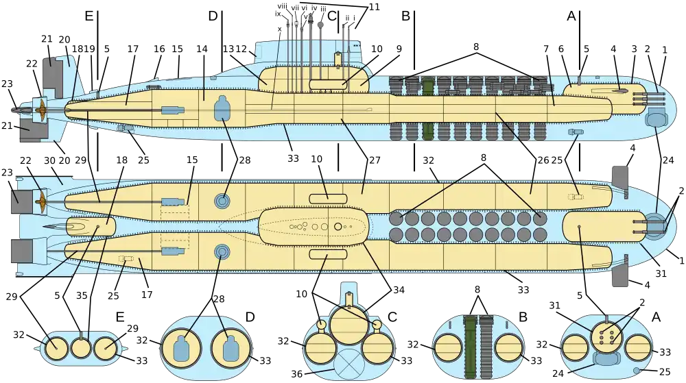 1 - coque hydrodynamique ; 2 - tubes lance-torpilles de 533 mm ; 3 - coque résistante de proue ; 4 - barres de plongée avant escamotables ; 5 - sas de sauvetage ; 6 - compartiment torpilles ; 7 - compartiment sonar ; 8 - Tubes lance-missiles P-39 ; 9 - poste central de navigation ; 10 - capsules de sauvetage ; 11 - dispositifs rétractables ; 12 - kiosque ; 13 - compartiment radio ; 14 - compartiment réacteur ; 15 - écoutilles des antennes de communication ; 16 - pare-glace des hélices ; 17 - compartiment turbines ; 18 - compartiment moteur ; 19 - guides hydrodynamiques ; 20 - plan vertical ; 21 - safran ; 22 - pompe-hélice ; 23 - barres de plongée arrière ; 24 - sonar ; 25 - propulseurs rétractables ; 26 - compartiment missiles ; 27 - compartiment équipage ; 28 - réacteurs nucléaires OК-650 ; 29 - lignes d'arbres ; 30 - stabilisateur ; 31 - coque résistante de proue ; 32 - coque résistante tribord ; 33 - coque résistante bâbord ; 34 - coque résistante centrale ; 35 - coque résistante de poupe ; 36 - réservoir de plongée rapide