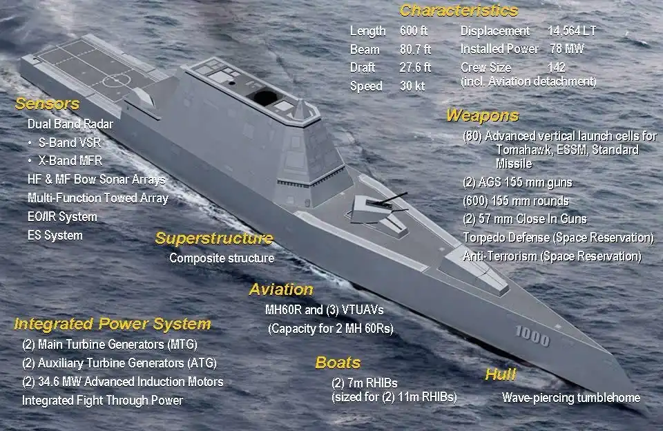 Cette classe a été conçue afin d'effectuer les bombardements de cibles terrestres, assurés jusqu'alors par les cuirassés de la classe Iowa, construits pendant les années 1940 et retirés de la flotte de réserve depuis 2006. Conçue pour être furtive, sa coque frégatée lui donne un aspect ressemblant à celui d'un cuirassé à coque en fer de la fin du XIXe siècle.