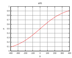 - ↑ La fonction réciproque p(D) donnant la probabilité de gain en fonction de la différence Elo D étant égale à :
