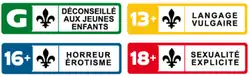 Les systèmes de classements à l'extérieur du Québec utilisent des catégories et des logos dérivés du Canadian Home Video Rating System (en)[12].