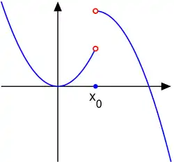 - la limite à gauche et la limite à droite en existent et sont finies et égales.Alors, si n'est pas égal à , x0 est appelée discontinuité apparente. La discontinuité peut être effacée dans le sens où la fonctionest continue en x = x0 ;