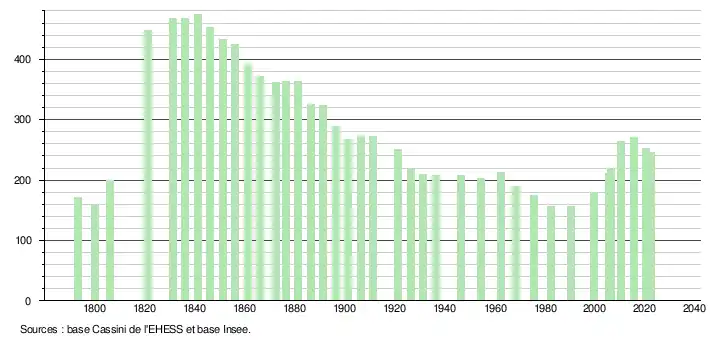 L'évolution du nombre d'habitants est connue à travers les recensements de la population effectués dans la commune depuis 1793. Pour les communes de moins de 10 000 habitants, une enquête de recensement portant sur toute la population est réalisée tous les cinq ans, les populations de référence des années intermédiaires étant quant à elles estimées par interpolation ou extrapolation[20]. Pour la commune, le premier recensement exhaustif entrant dans le cadre du nouveau dispositif a été réalisé en 2005[21].