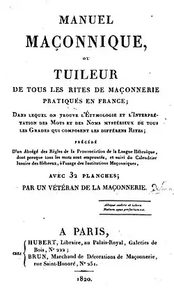 - Le titre de la première édition de l'ouvrage en 1820 est : Manuel Maçonnique ou Tuileur de tous les rites de maçonnerie pratiqués en France ; dans lequel on trouve l’étymologie et l’interprétation des mots et des noms mystérieux de tous les grades qui composent les différents rites. Précédé d’un abrégé des règles de la prononciation de la langue hébraïque, dont presque tous les mots sont empruntés, et suivi du calendrier lunaire des Hébreux, à l’usage des institutions maçonniques. Avec 32 planches. Par un Vétéran de la Maçonnerie. Hubert & Brun (Paris), 1820[7].