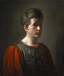 Le tout jeune peintre se représente sur un fond vert grisé, de trois quarts à droite, vêtu d’une tenue des plus composites, costume de théâtre, de tableau vivant ou de cortège historique. Il porte un plastron d’armure de style Renaissance à décor de fleurs, de rinceaux et d’oiseaux sur un vêtement troubadour à amples manches rouges qui laisse dépasser une chemise blanche bordée d’un étroit tuyauté à l’encolure. Les cheveux bruns ébouriffés, le visage mangé d’ombre, l’air finaud du modèle forment un ensemble disparate et charmant[27].