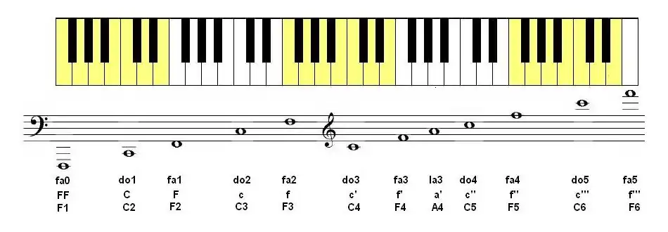 Le clavecin possède un ou deux claviers, très exceptionnellement trois[9]. Leur étendue n'est pas normalisée, elle est inférieure à celle du piano et varie généralement entre 4,5 et 5 octaves, soit de 56[note 12] à 61 notes[note 13] : souvent de fa0 à fa5 (anglais/allemand : FF à f''', américain : F1 à F6). N.B. le la3 correspond au diapason, 440 Hz (classique) ou 415 Hz voire 392 Hz (baroque) ; le do4 définit le module des cordes.