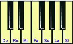 - les unes, plus longues et plus basses (souvent de couleur blanche ou claire), correspondent, sur plusieurs octaves, aux sept notes de la gamme diatonique non altérée (soit do majeur ou la mineur naturel), et sont appelées marches ;