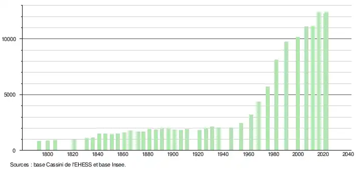 - ↑ Par convention dans Wikipédia, le principe a été retenu de n’afficher dans le tableau des recensements et le graphique, pour les populations de référence postérieures à 1999, que les populations correspondant à une enquête exhaustive de recensement pour les communes de moins de 10 000 habitants, et que les populations des années 2006, 2011, 2016, etc. pour les communes de plus de 10 000 habitants, ainsi que la dernière population de référence publiée par l’Insee pour l'ensemble des communes.