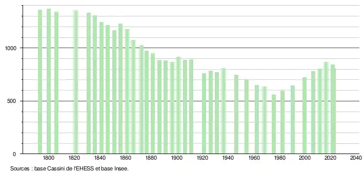 L'évolution du nombre d'habitants est connue à travers les recensements de la population effectués dans la commune depuis 1793. Pour les communes de moins de 10 000 habitants, une enquête de recensement portant sur toute la population est réalisée tous les cinq ans, les populations de référence des années intermédiaires étant quant à elles estimées par interpolation ou extrapolation[21]. Pour la commune, le premier recensement exhaustif entrant dans le cadre du nouveau dispositif a été réalisé en 2006[22].