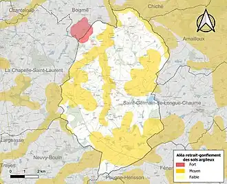 Les mouvements de terrains susceptibles de se produire sur la commune sont des tassements différentiels[16]. Le retrait-gonflement des sols argileux est susceptible d'engendrer des dommages importants aux bâtiments en cas d'alternance de périodes de sécheresse et de pluie[17]. 47,5 % de la superficie communale est en aléa moyen ou fort (54,9 % au niveau départemental et 48,5 % au niveau national)[Carte 2]. Depuis le , en application de la loi ELAN, différentes contraintes s'imposent aux vendeurs, maîtres d'ouvrages ou constructeurs de biens situés dans une zone classée en aléa moyen ou fort[Note 5],[18].