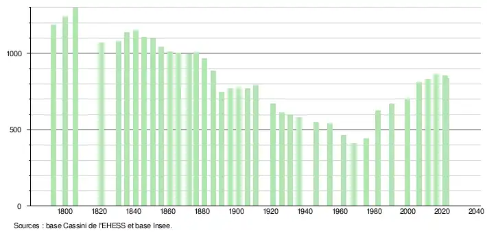 L'évolution du nombre d'habitants est connue à travers les recensements de la population effectués dans la commune depuis 1793. Pour les communes de moins de 10 000 habitants, une enquête de recensement portant sur toute la population est réalisée tous les cinq ans, les populations de référence des années intermédiaires étant quant à elles estimées par interpolation ou extrapolation[24]. Pour la commune, le premier recensement exhaustif entrant dans le cadre du nouveau dispositif a été réalisé en 2006[25].
