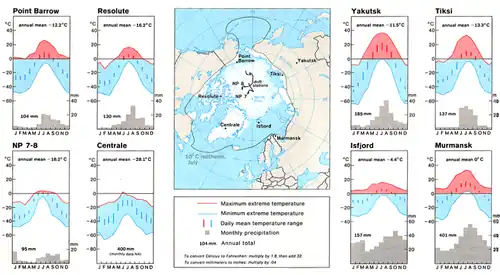 Dans le figuré ci-dessus montrant les variables climatiques des stations, le tracé en bas à gauche, pour NP 7-8, est représentatif des conditions au-dessus du bassin arctique. Ce graphique montre les données des stations dérivantes soviétiques du pôle Nord, les numéros 7 et 8. Il montre que la température moyenne des mois les plus froids se situe dans les -30°C, et que la température augmente rapidement d'avril à mai ; juillet est le mois le plus chaud, et le rétrécissement des lignes des températures maximales et minimales montre que la température ne s'éloigne pas beaucoup du point de congélation au milieu de l'été ; d'août à décembre, la température baisse de façon constante. La faible amplitude des températures journalières (longueur des barres verticales) s'explique par le fait que l'élévation du soleil au-dessus de l'horizon ne varie pas beaucoup ou pas du tout dans cette région au cours d'une journée.