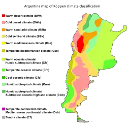 D'abord subtropical au nord, le climat devient tempéré dans le Rio de la Plata puis froid en Patagonie et en Terre de Feu[2]. L'altitude (de −100 m à presque 7 000 m) et la longueur du pays (du 22e parallèle sud jusqu'au 55e parallèle sud) font des climats divers dans l'Argentine. C'est un pays globalement désertique, en dehors de la partie septentrionale, très humide[3]. Les régions du Nord-Ouest au Sud-Est sont désertiques, c'est ce que l'on appelle la "diagonale aride"[3].