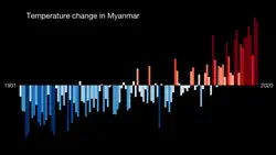 La hausse des températures et l'augmentation de la sécheresse au Myanmar ont entraîné une diminution des sources d'eau dans les villages dans tout le pays, détruit les rendements agricoles des pois, de la canne à sucre, des tomates et du riz, et devraient continuer à avoir des effets négatifs sur la production agricole et la sécurité alimentaire. destruction des cultures et érosion des sols à long terme[3]. Il existe une forte dépendance à l’agriculture pluviale, car plus de 70% des moyens de subsistance de la population dépendent du capital naturel et 40% des Le PIB dépend de l'agriculture, de l'élevage, de la pêche et de la sylviculture[4],[3]. Dans la zone sèche du Myanmar, plus de sécheresses extrêmes et des pertes de services écosystémiques naturels qui jouent un rôle dans la rétention des sédiments, forcent les habitants des zones plus rurales à parcourir des kilomètres pour trouver de l'eau là où les lacs n'ont pas séché, ce qui pose des problèmes de subsistance considérables[5].