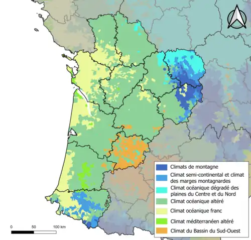 La région Nouvelle-Aquitaine est historiquement partagée entre plusieurs climats[5] :