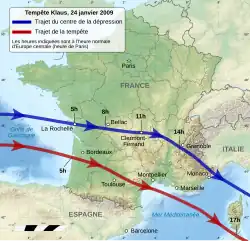 La tempête Klaus atteint les côtes aquitaines dans la nuit du 23 au 24 janvier et traverse les régions du Languedoc-Roussillon et du Midi-Pyrénées. Elle est accompagnée de rafales de vent de plus de 170 km/h. Les dégâts sont cependant importants (5 G€) et ont affecté le secteur forestier à hauteur de 3 milliards d’euros, les dommages assurés s'élèvent à 1,3 G€, 11 morts, 9 départements reconnus en catastrophe naturelle[42].