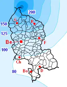 Sur le diagramme ci-contre, les barres verticales représentent la moyenne des précipitations à Belfort relevées par Météo-France de 1971 à 2000. On constate deux minima : au printemps et en été. L'hiver correspond à un maximum de précipitations : pluie ou neige. Mais ces valeurs statistiques gomment les variations qui se produisent d'une année sur l'autre. La courbe en vert correspond à la hauteur d'eau reçue à Bourg-sous-Châtelet pour chaque mois de l'année 2005. Les pluies d'été sont le plus souvent apportées par des averses orageuses qui déversent en une seule journée une quantité d'eau parfois importante : 60mm d'eau à Joncherey le .